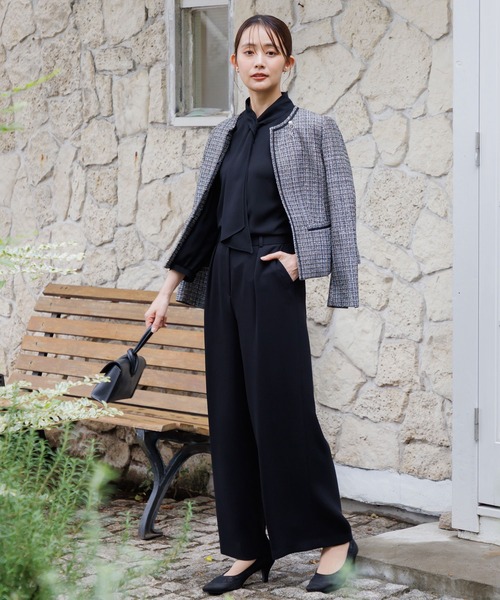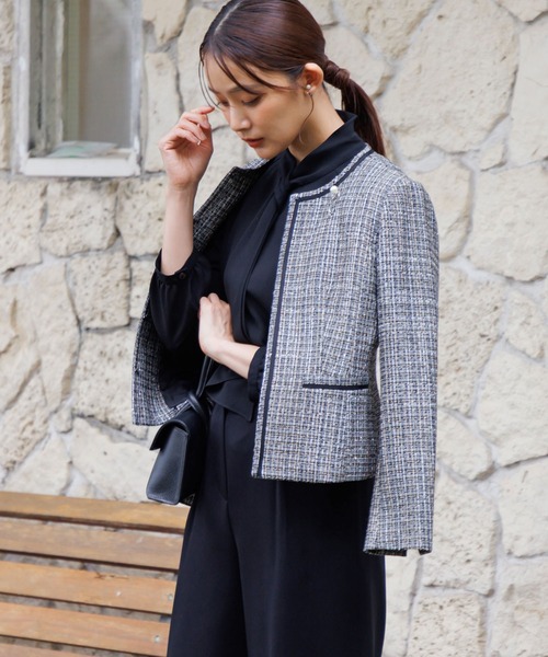 シルエットも堅苦しくならない、サッと羽織って大人かわいい装いを演出するノーカラージャケット。