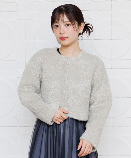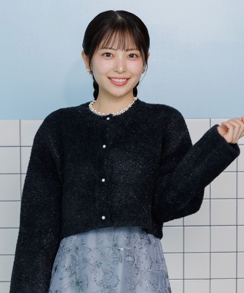 ドレスに羽織っても着映えするラメシャギーのニット素材に、パールボタンでオケージョンらしさをプラス。
