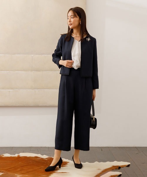 ややコンパクトめに仕上げたノーカラーのブレードジャケットは卒入学式スタイルにはもちろん、