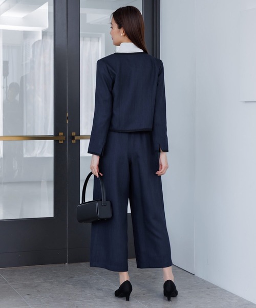 ジャケットとワイドパンツを同素材で仕立てたセットアップ。