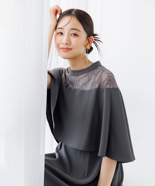 人気のケープデザインを無地素材とレースでまとめた一着。