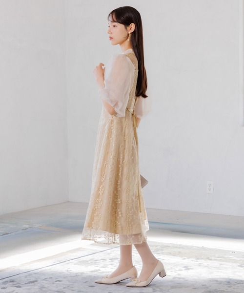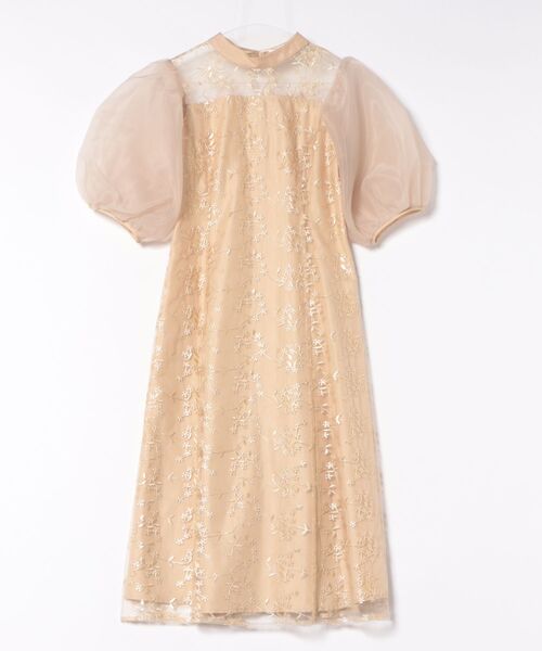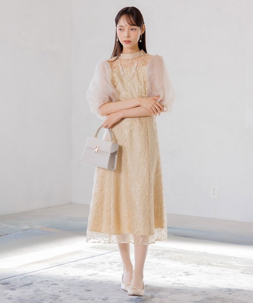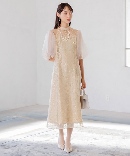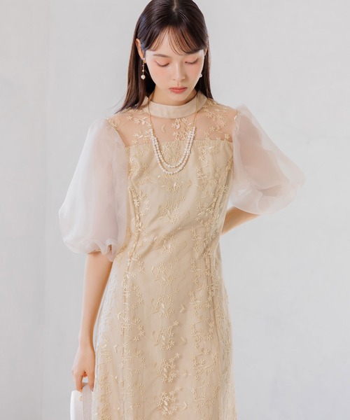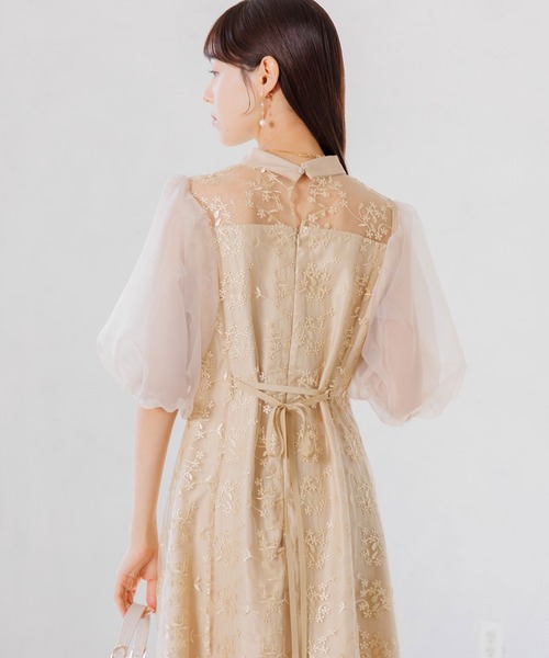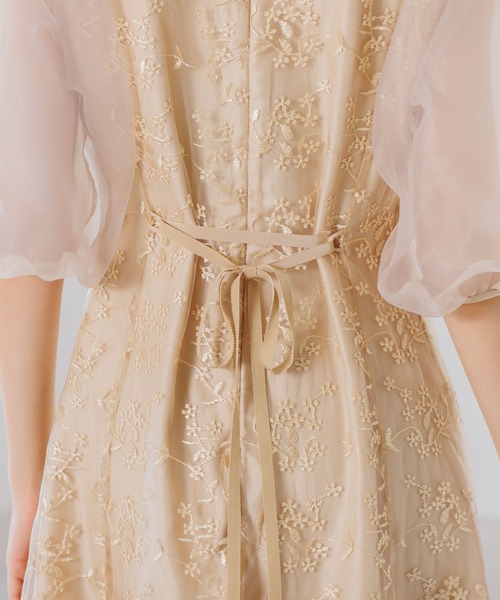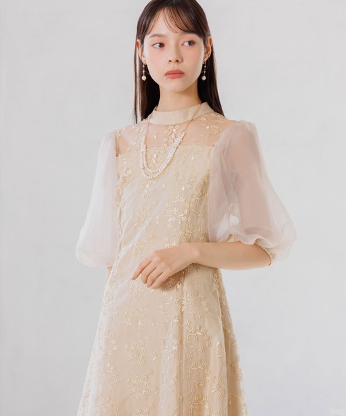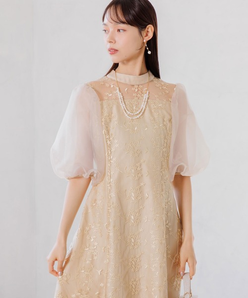 オーガンジーパフスリーブ フラワー刺繍レースドレス