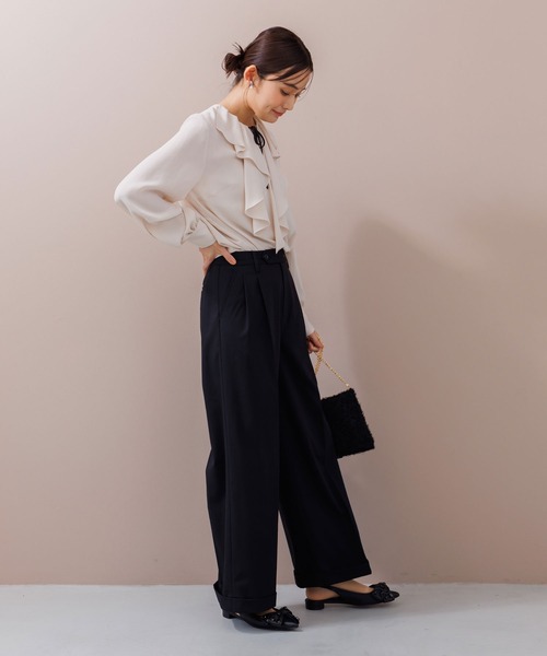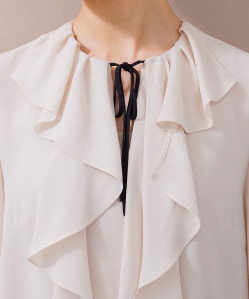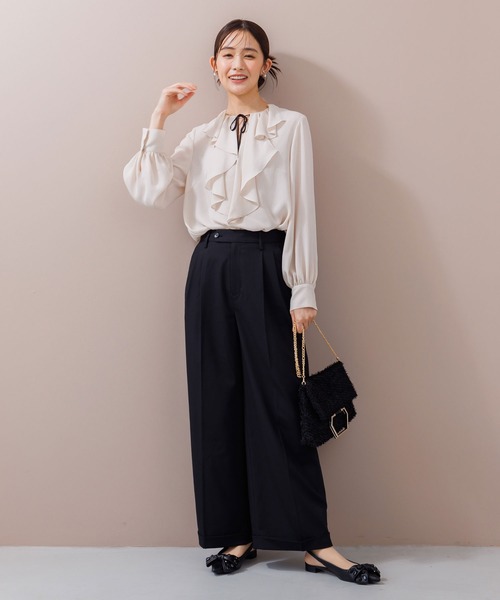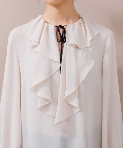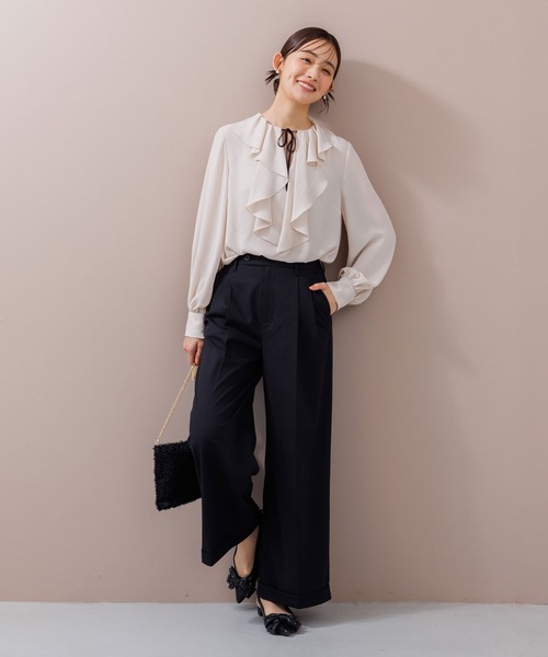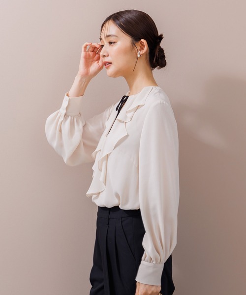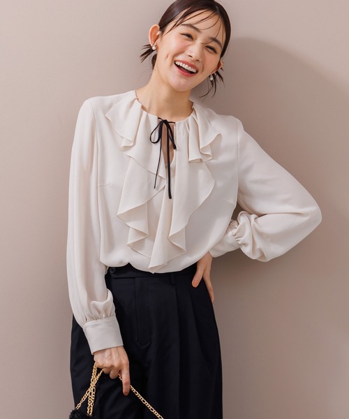 胸元のラッフルフリルをあしらった華やかでこなれ感のあるブラウス。