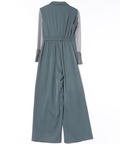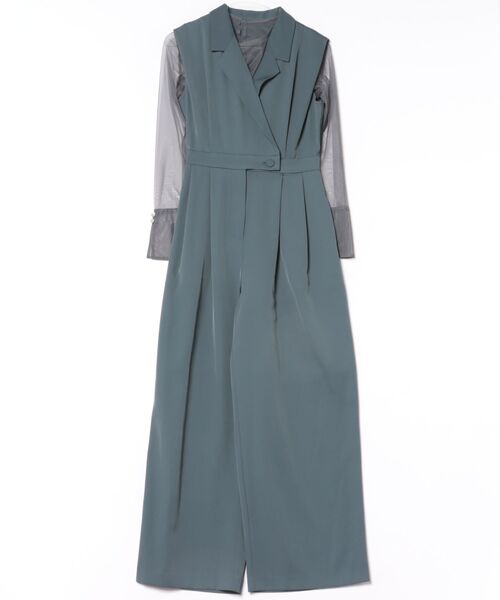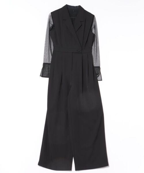 テーラードカラーのオールインワンドレスとシアートップスのセット。