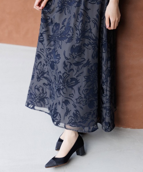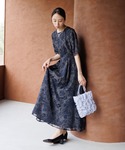 線画のような上品な花柄がポイントでデザインはタックを入れた人気の細見えするフィット&フレアシルエット。